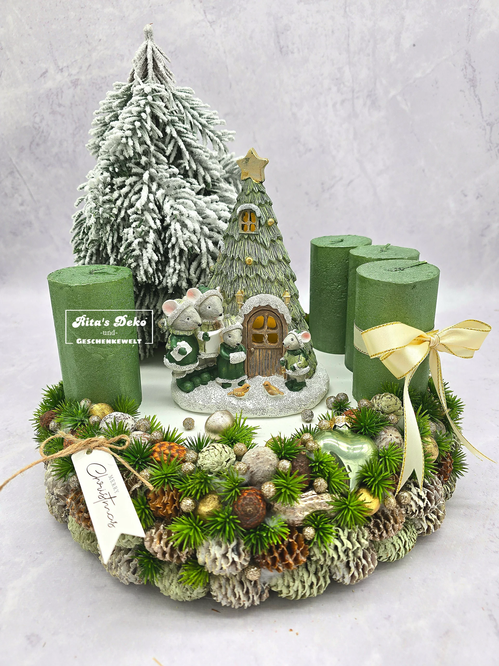 Der Kranz ist mit Naturmaterialien, Tannenzapfen, Beeren und zarten Goldakzenten verziert und mit vier passenden Kerzen in Grün ergänzt. Eine elegante Schleife rundet das harmonische Gesamtbild ab.