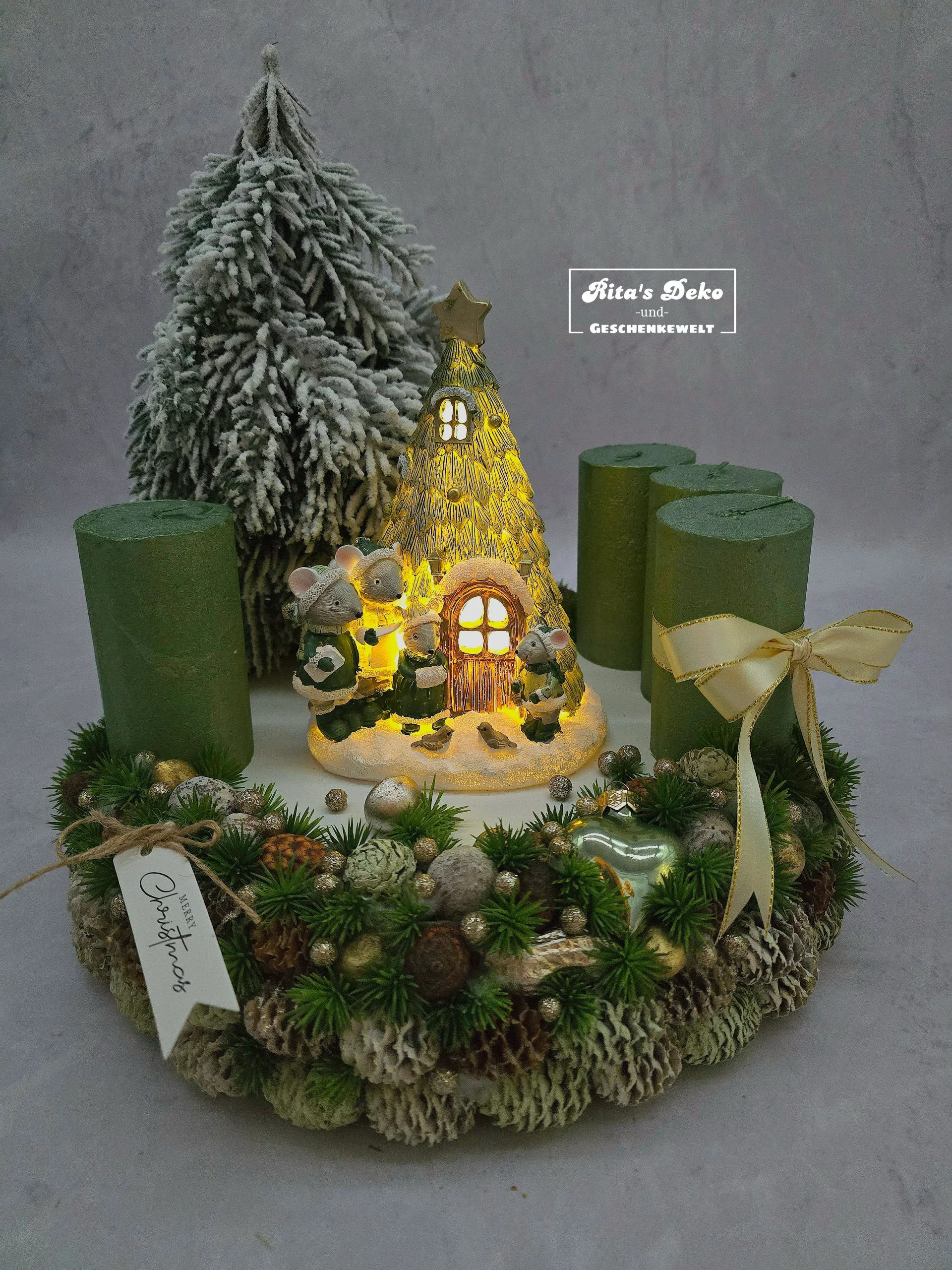 Im Mittelpunkt steht eine kleine Mäusefamilie vor ihrem leuchtenden Tannenhaus, das durch die integrierte LED-Beleuchtung warm erstrahlt und eine märchenhafte Atmosphäre schafft.