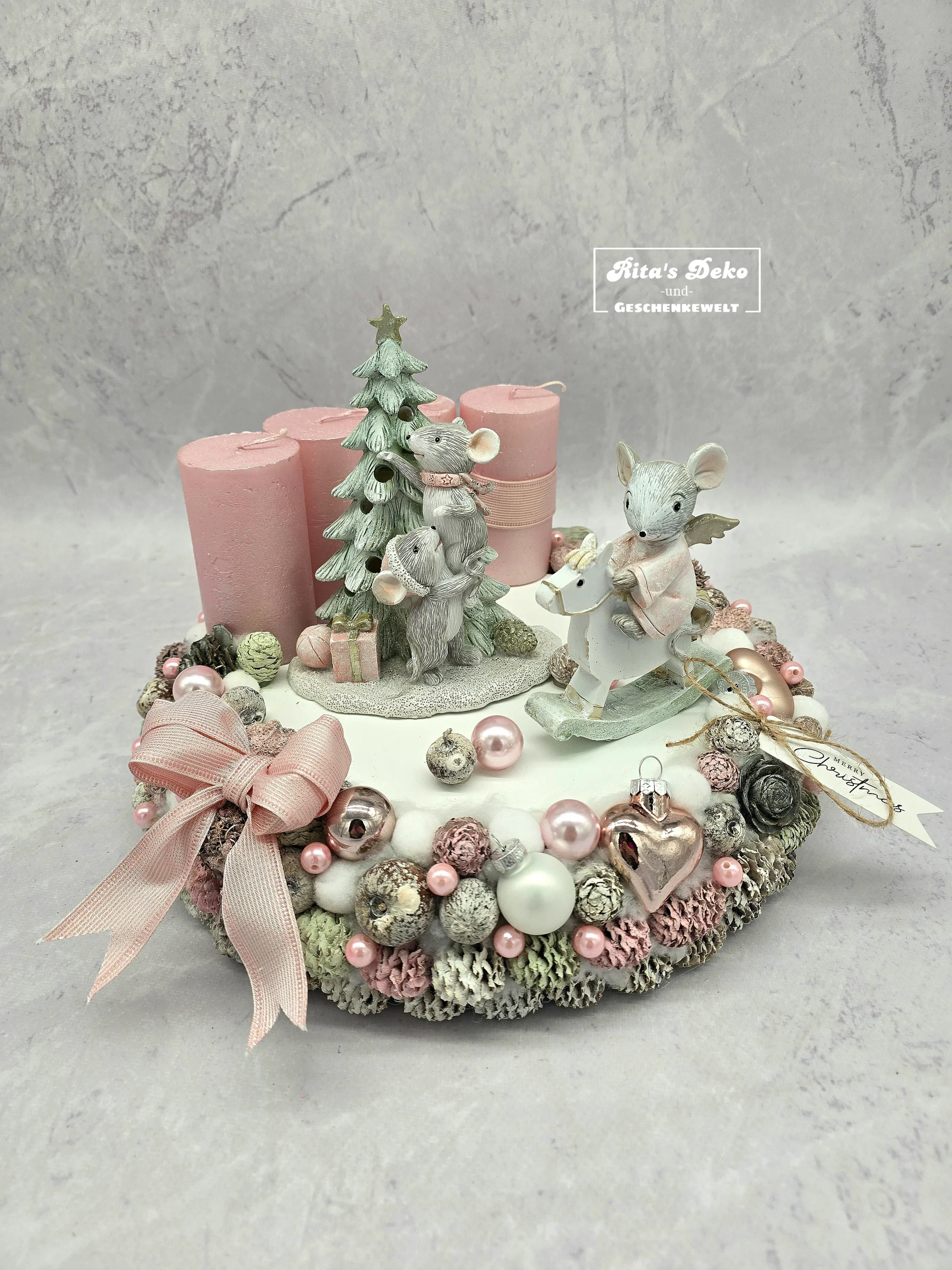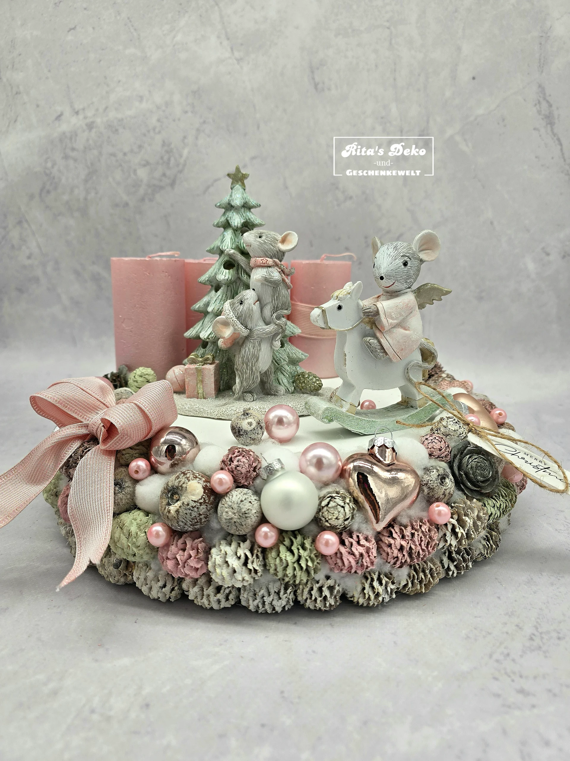 Ein zauberhafter Adventskranz in sanften Rosa- und Pastelltönen.