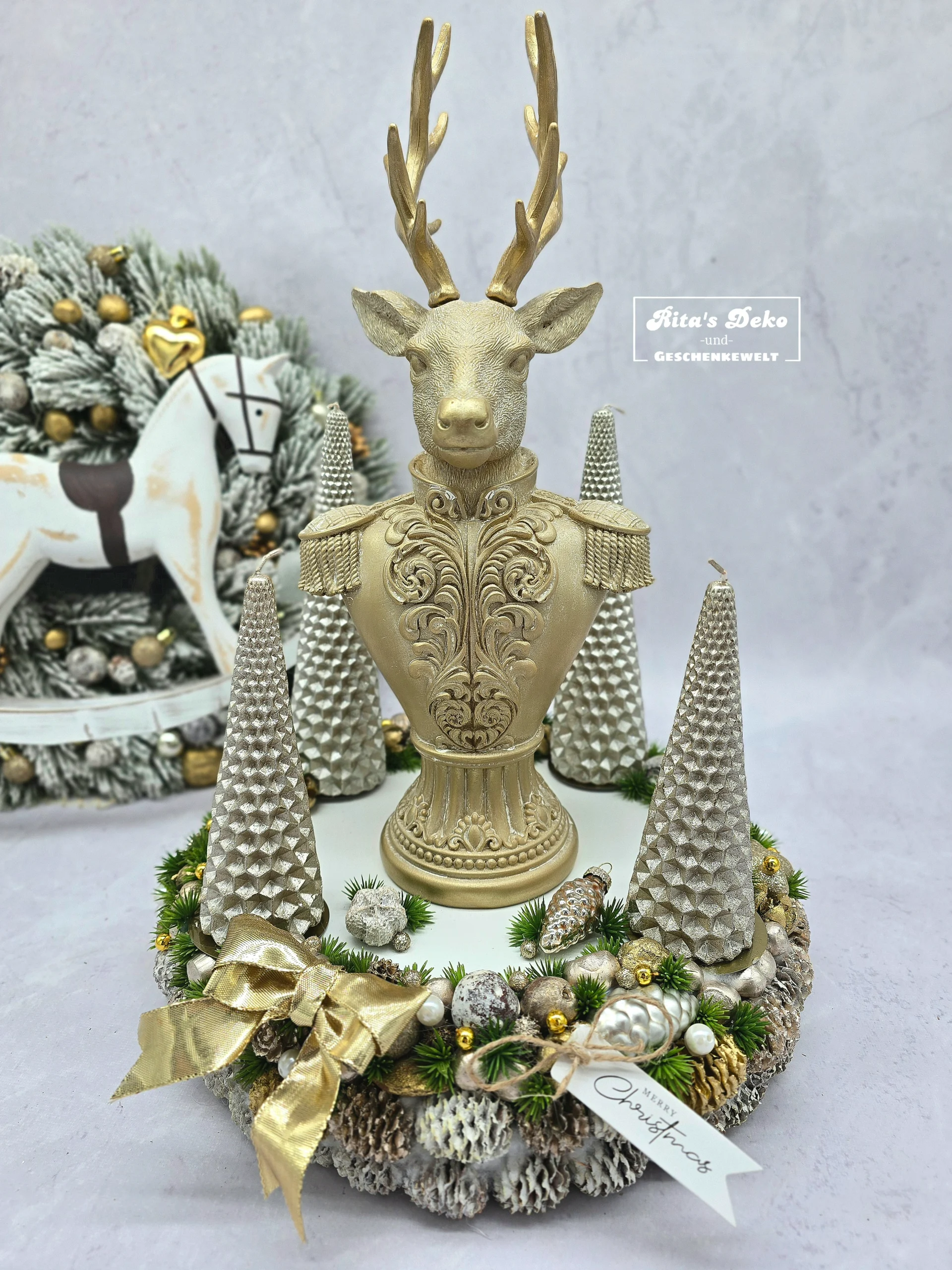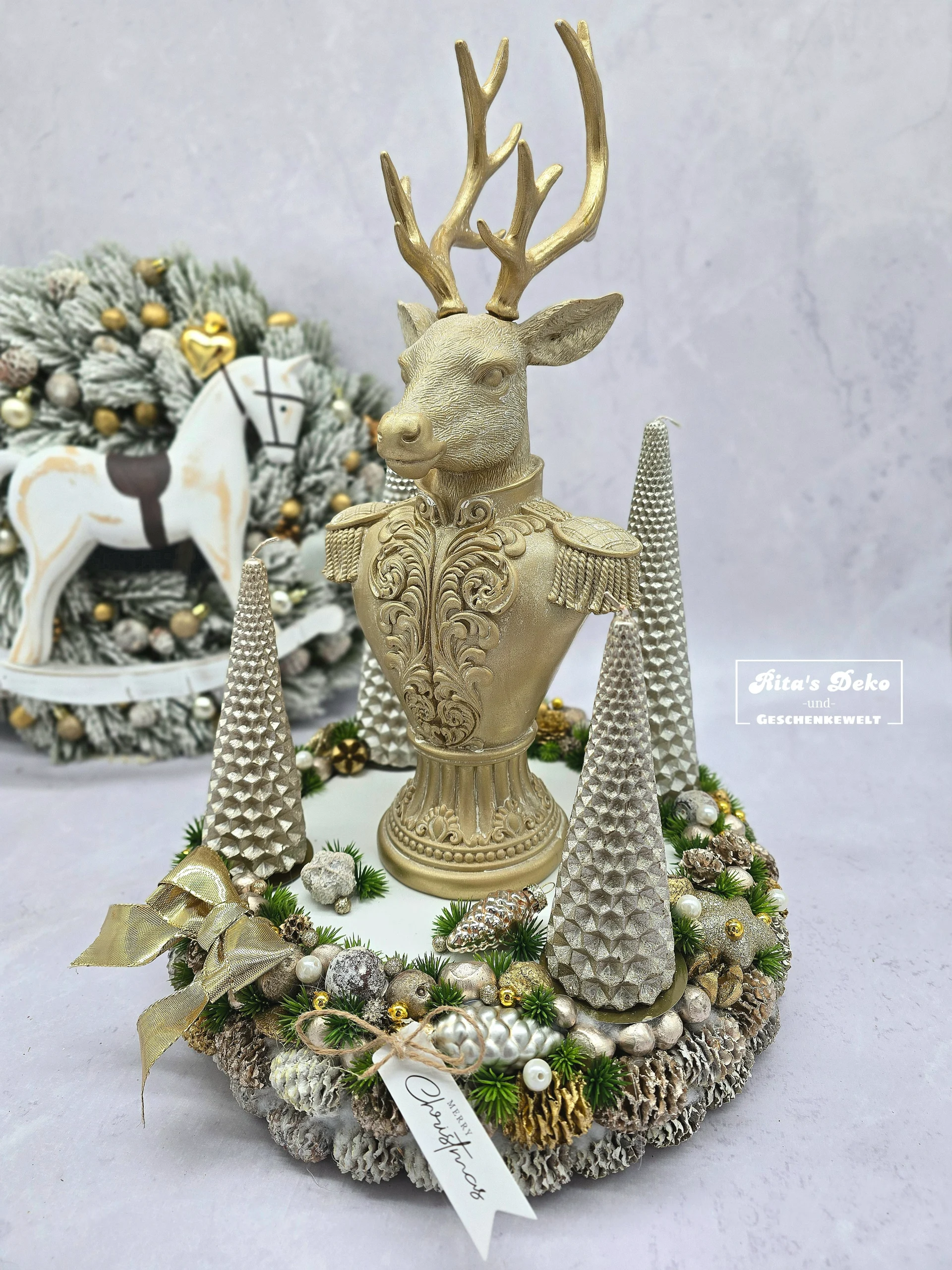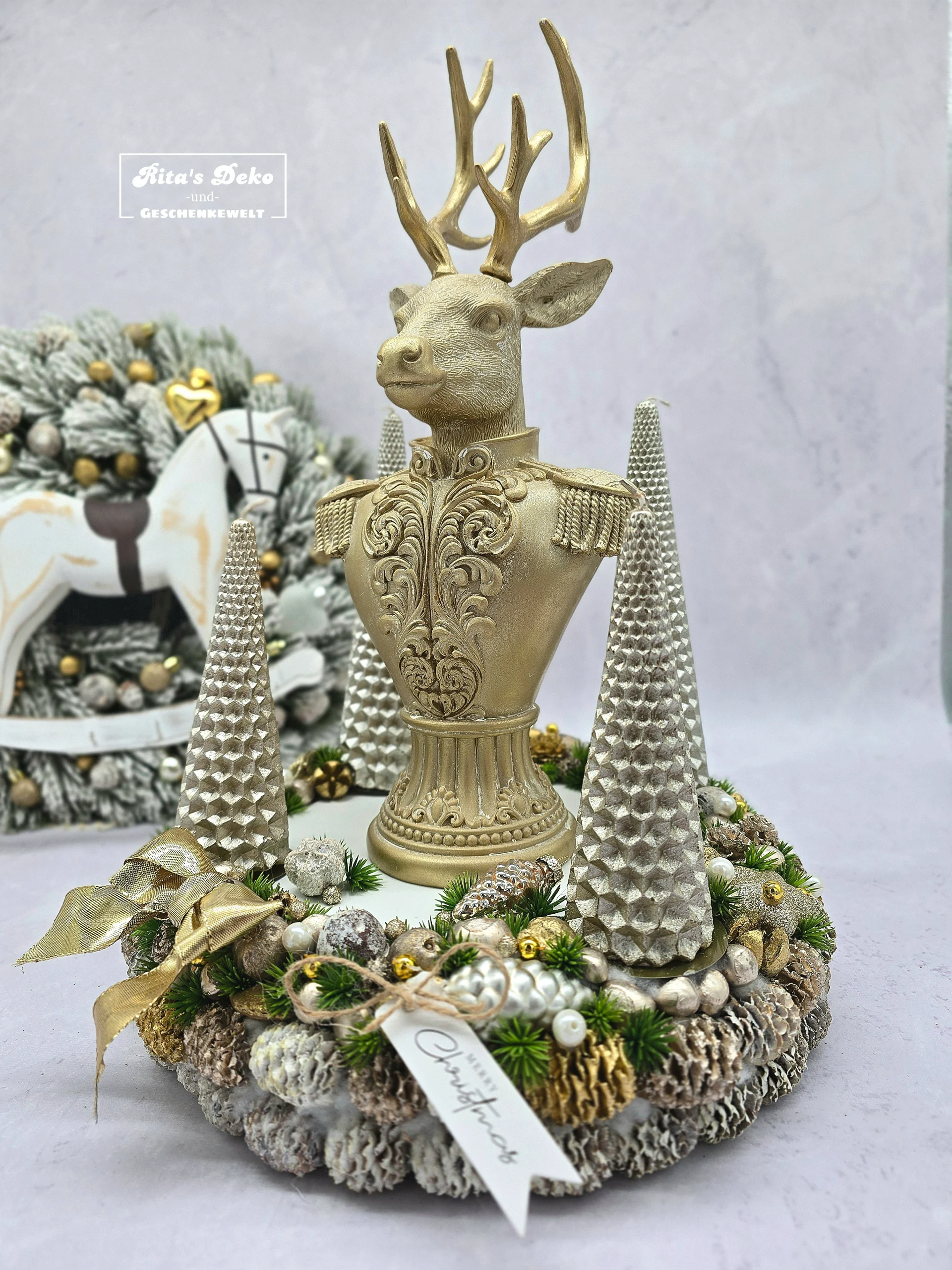 Im Mittelpunkt steht eine edle, goldene Hirschbüste – königlich, stilvoll und außergewöhnlich dekorativ. Umgeben von zwei fein strukturierten, goldfarbenen Bäumchen und einem Kranz aus Zapfen, Perlen, Naturmaterialien und glänzenden Akzenten entsteht ein harmonisches, luxuriöses Gesamtbild. 🌲💛