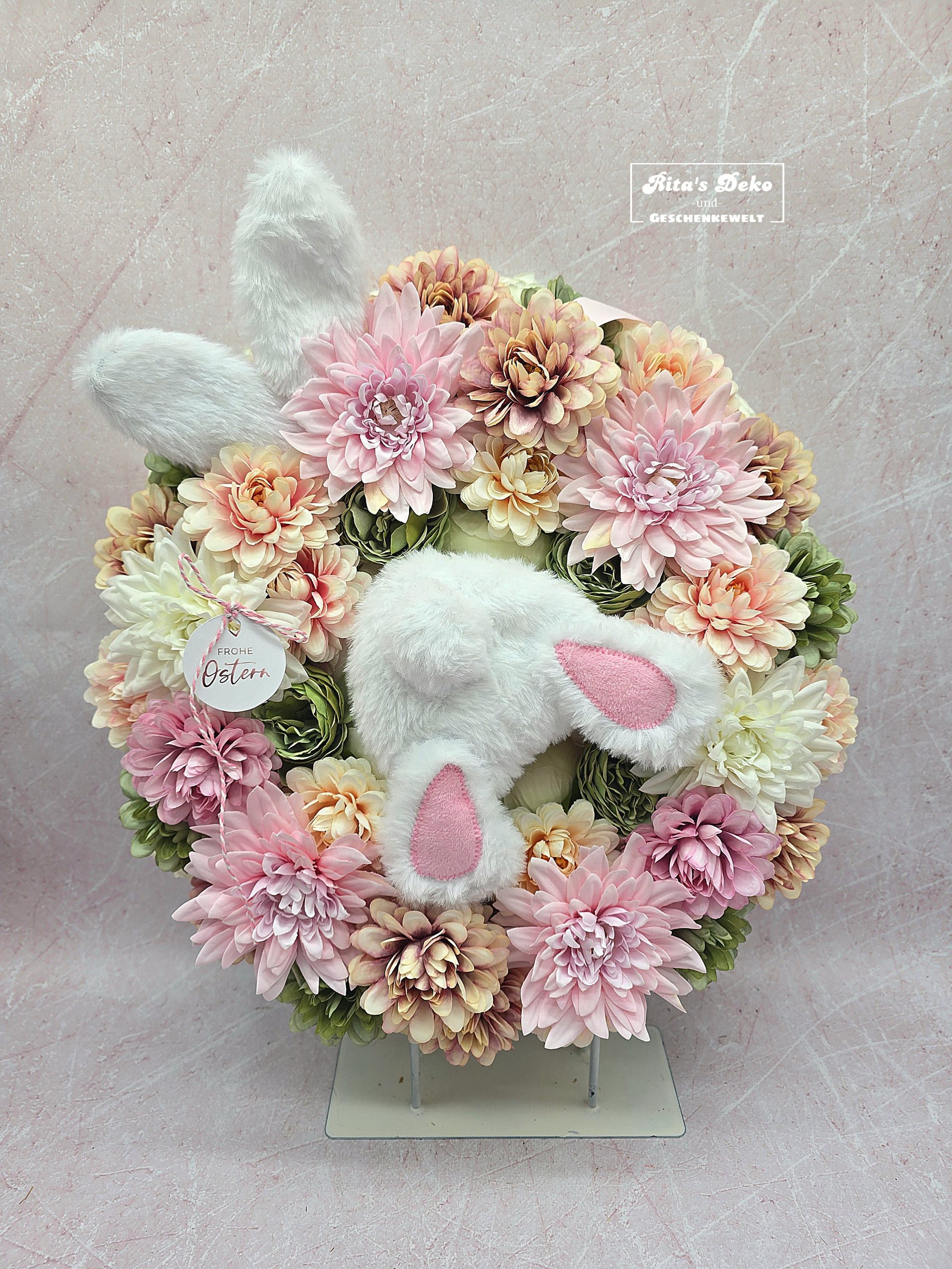 Der kleine Hase, der neugierig in den Kranz hineinspringt, macht dieses Arrangement einfach unwiderstehlich und verspielt – ein echter Hingucker für Tür, Wand oder als frühlingshafte Dekoration im Zuhause.