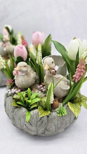 Diese bezaubernde Tischdekoration bringt den Frühling direkt in dein Zuhause! Ein liebevoll gestaltetes Nest in Form eines Blumentopfes bildet die Basis dieser einzigartigen Komposition. In sanften Weiß- und Rosatönen erstrahlen wunderschöne Traubenhyazinthen und Tulpen, die für eine frische, frühlingshafte Atmosphäre sorgen.
