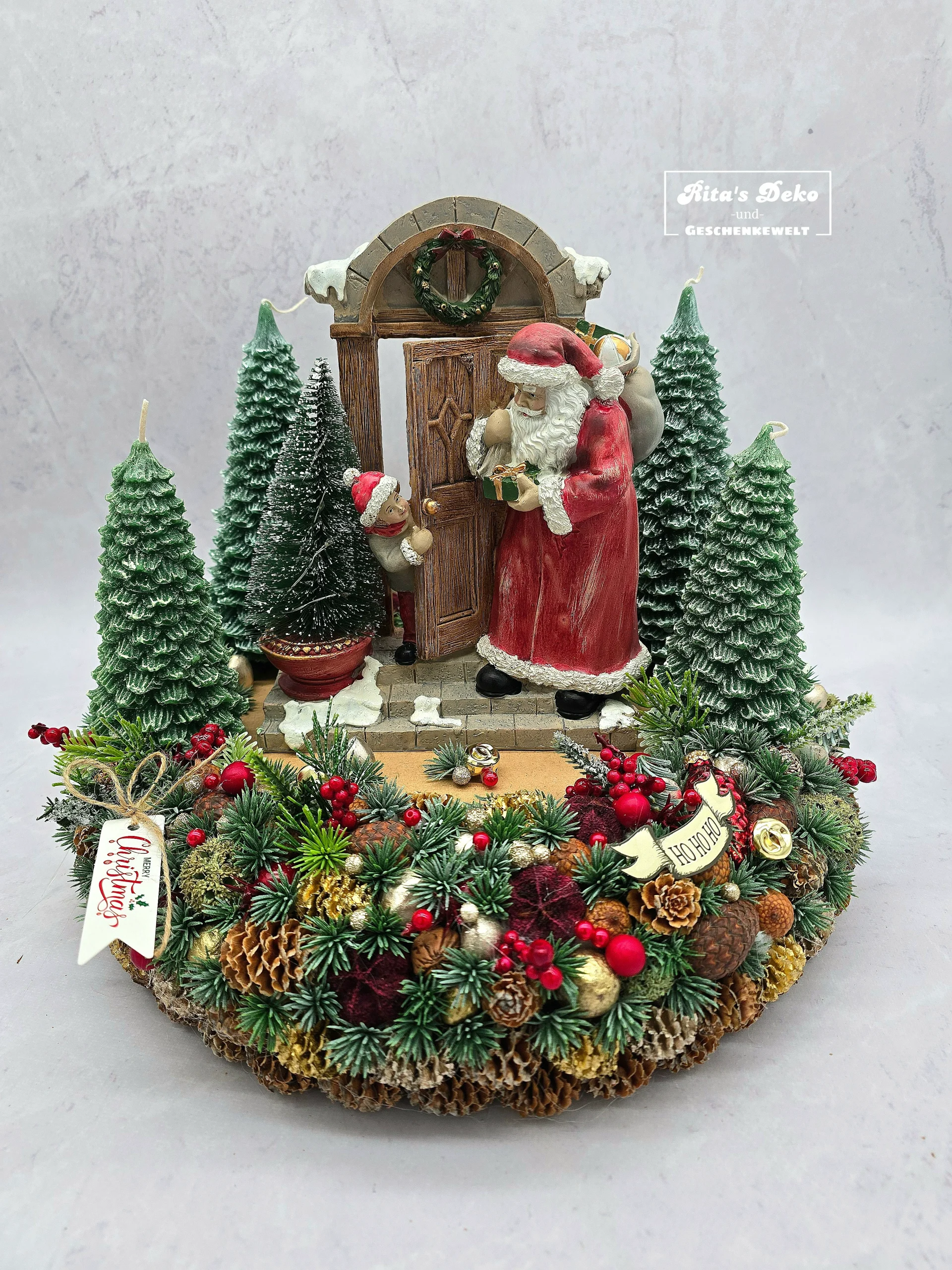 Ein einzigartiger Adventskranz, der den schönsten Moment der Weihnachtszeit einfängt – der Weihnachtsmann steht mit Geschenken vor der Tür, während ein fröhliches Kind neugierig hinausschaut.