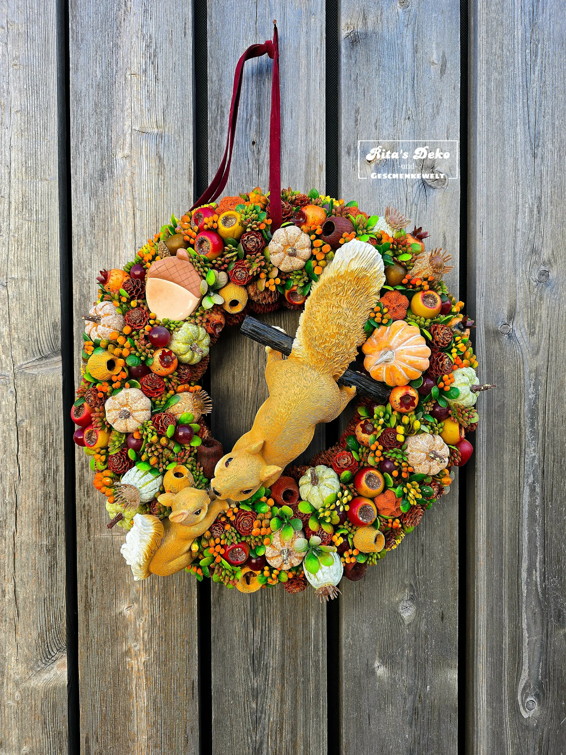 Dieser traumhafte Herbstkranz (ca. 36 cm Durchmesser) ist ein echtes Kunstwerk, das mit unglaublich viel Liebe zum Detail gestaltet wurde. Zwei niedliche Eichhörnchen-Figuren schmücken die Mitte und verleihen dem Kranz eine besonders warme, verspielte Ausstrahlung.