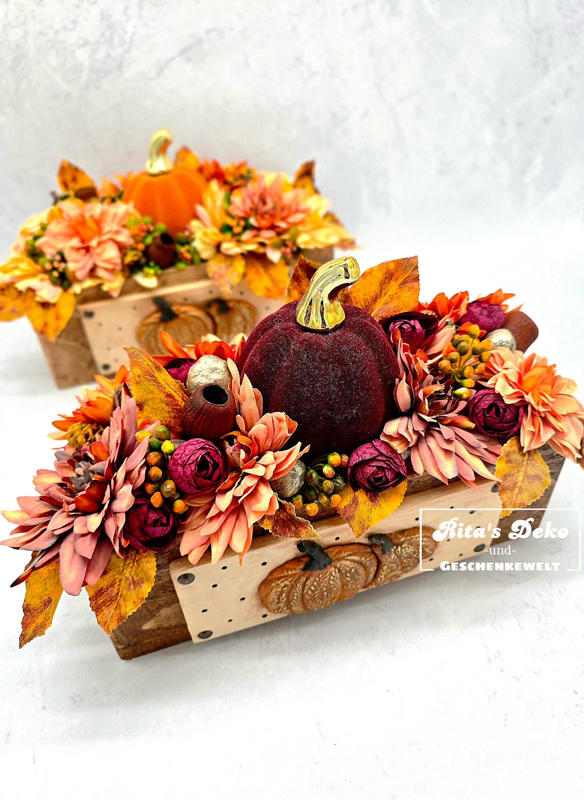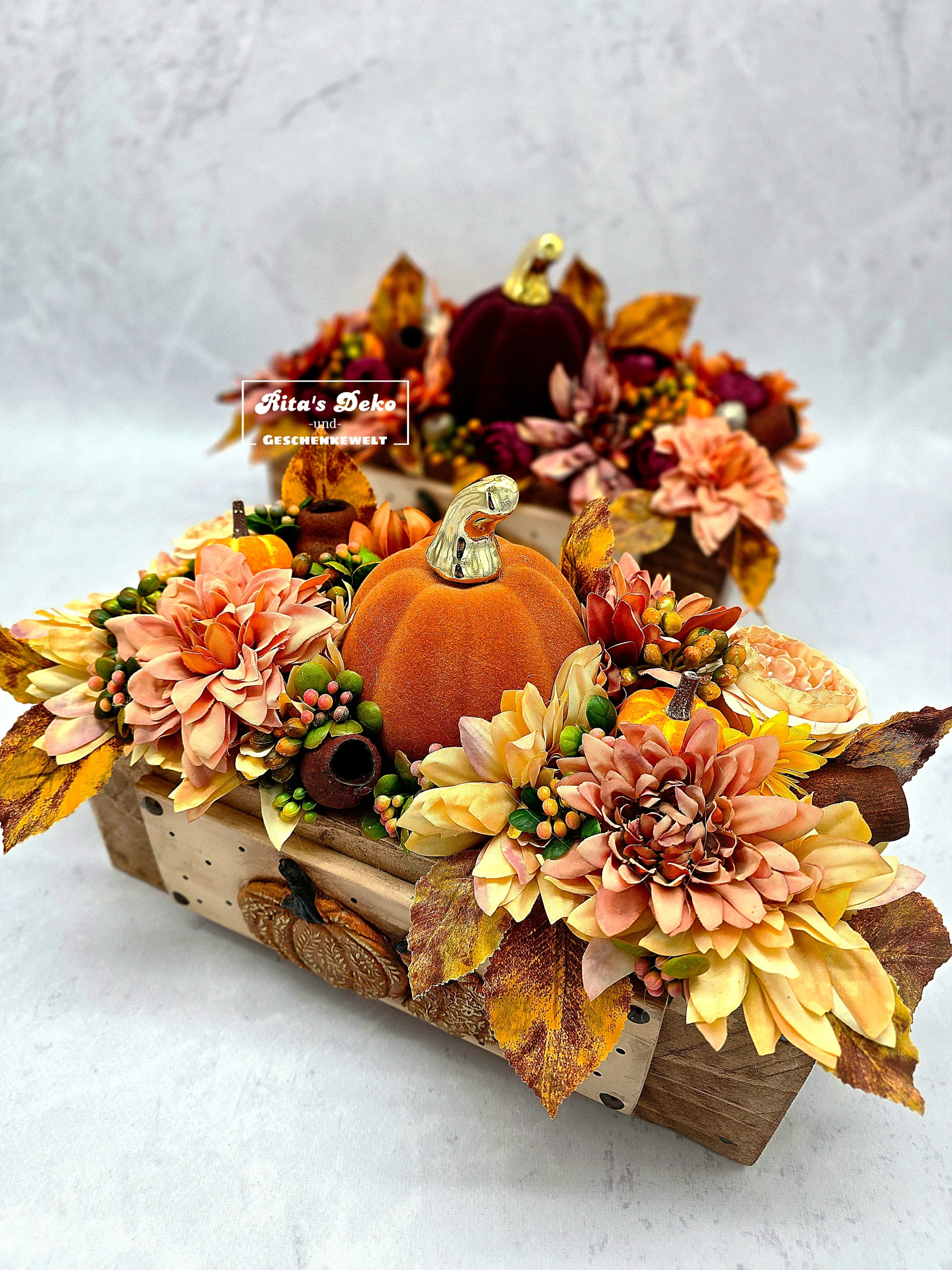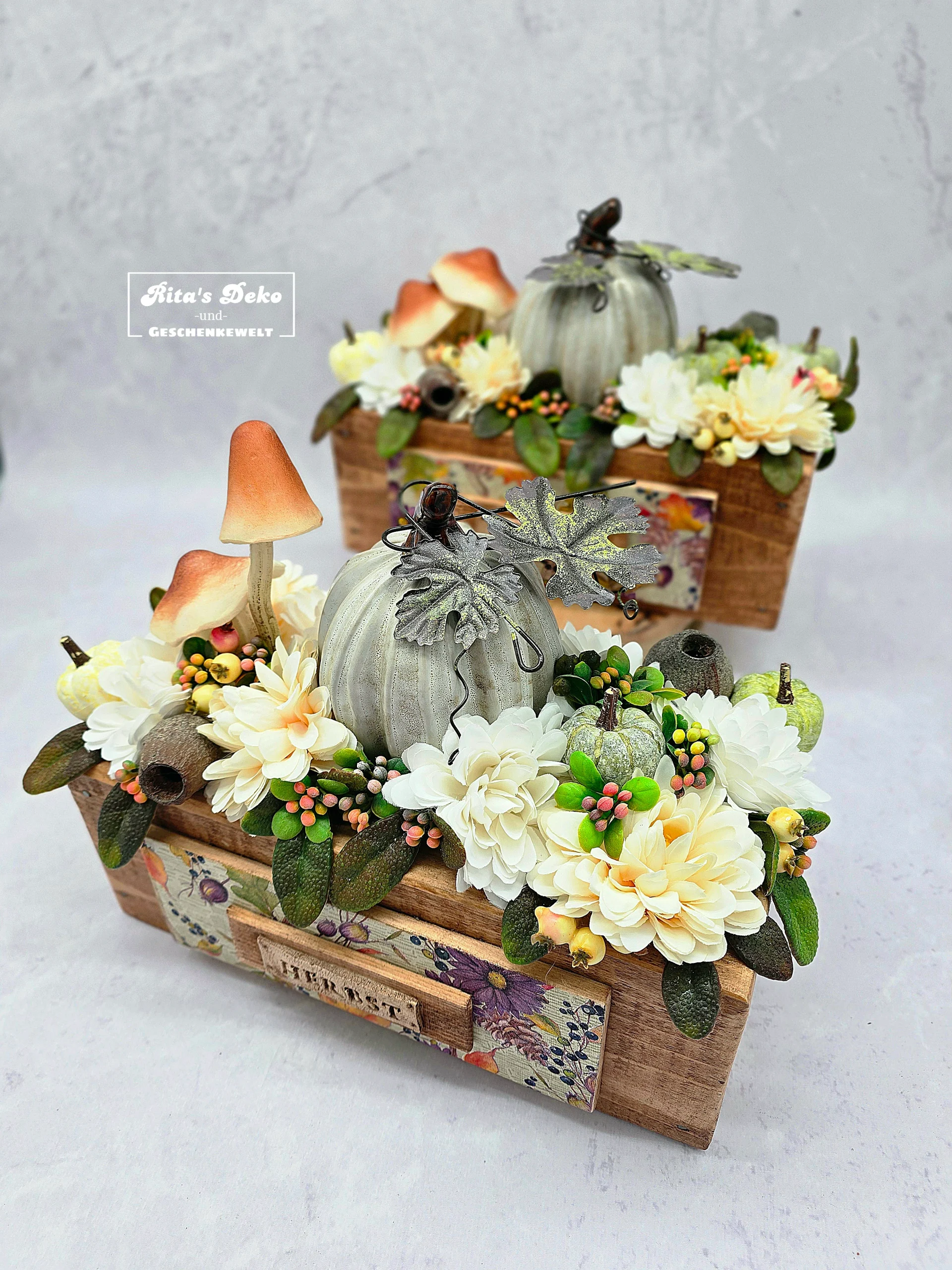 Diese liebevoll gestaltete Holzbox (ca. 30 x 15 cm) bringt den goldenen Herbst direkt zu dir nach Hause. Gefüllt mit hochwertigen, täuschend echt wirkenden Kunstblumen, Beeren und Blättern, entsteht eine detailreiche und warme Komposition.
