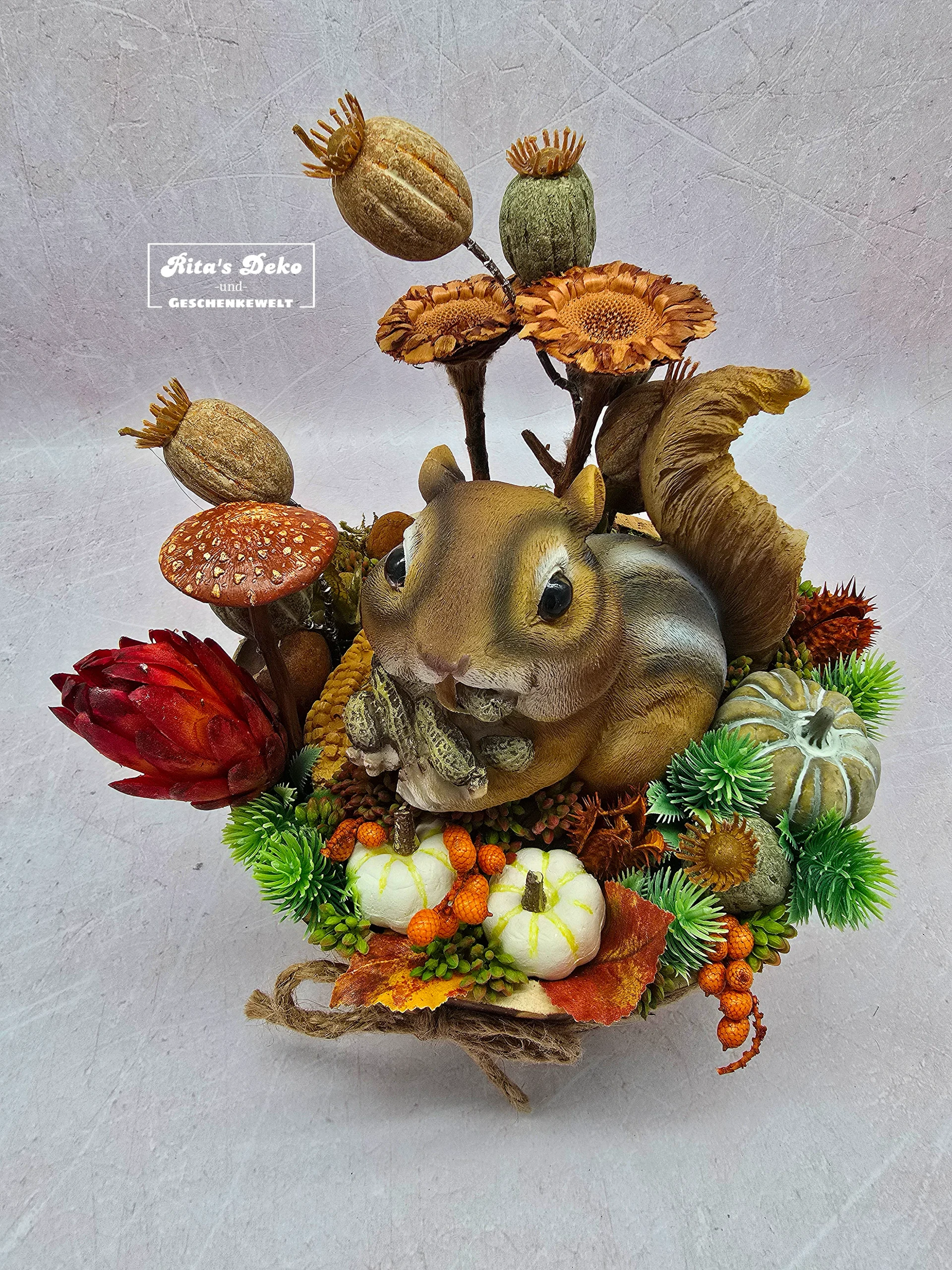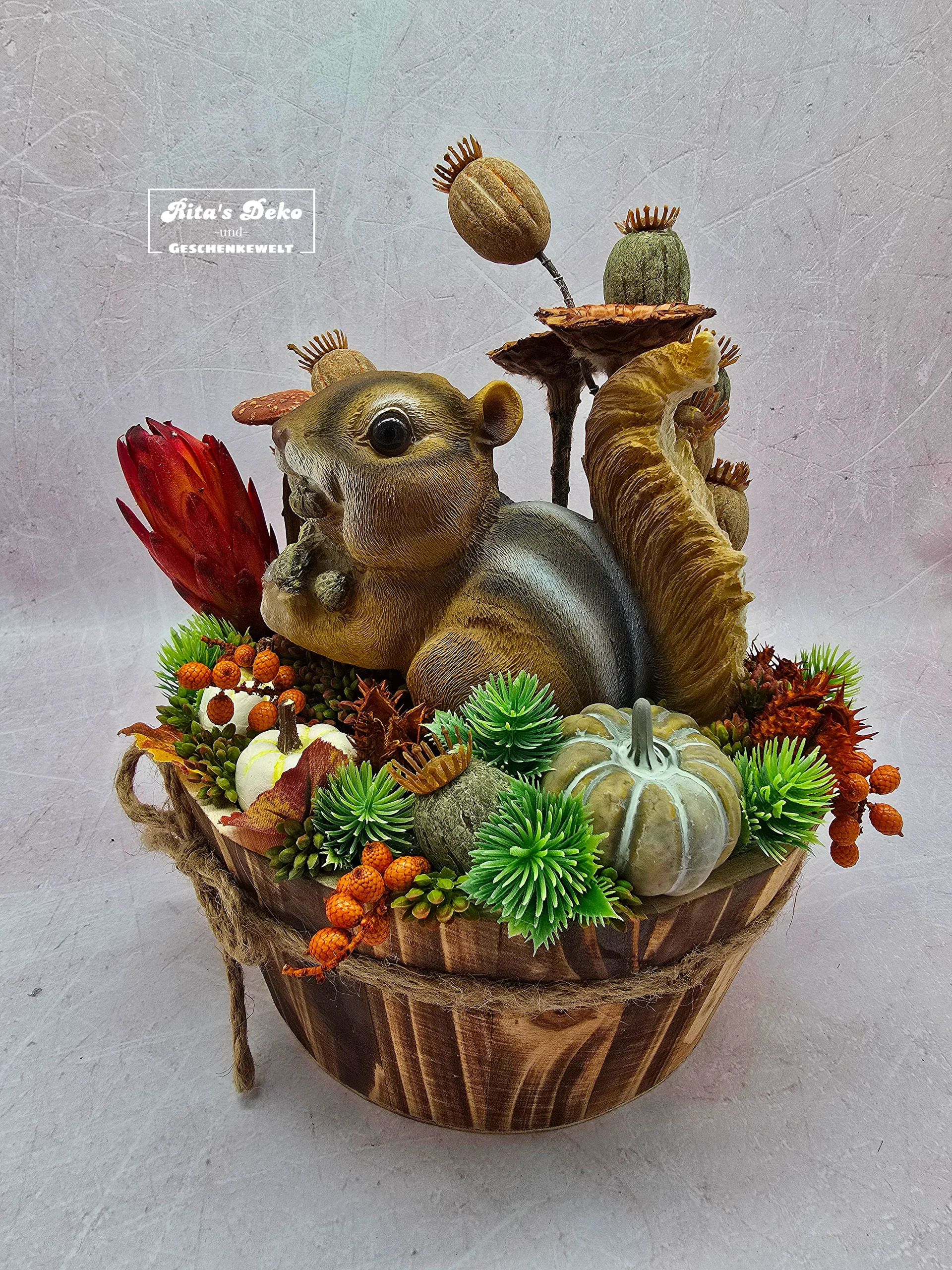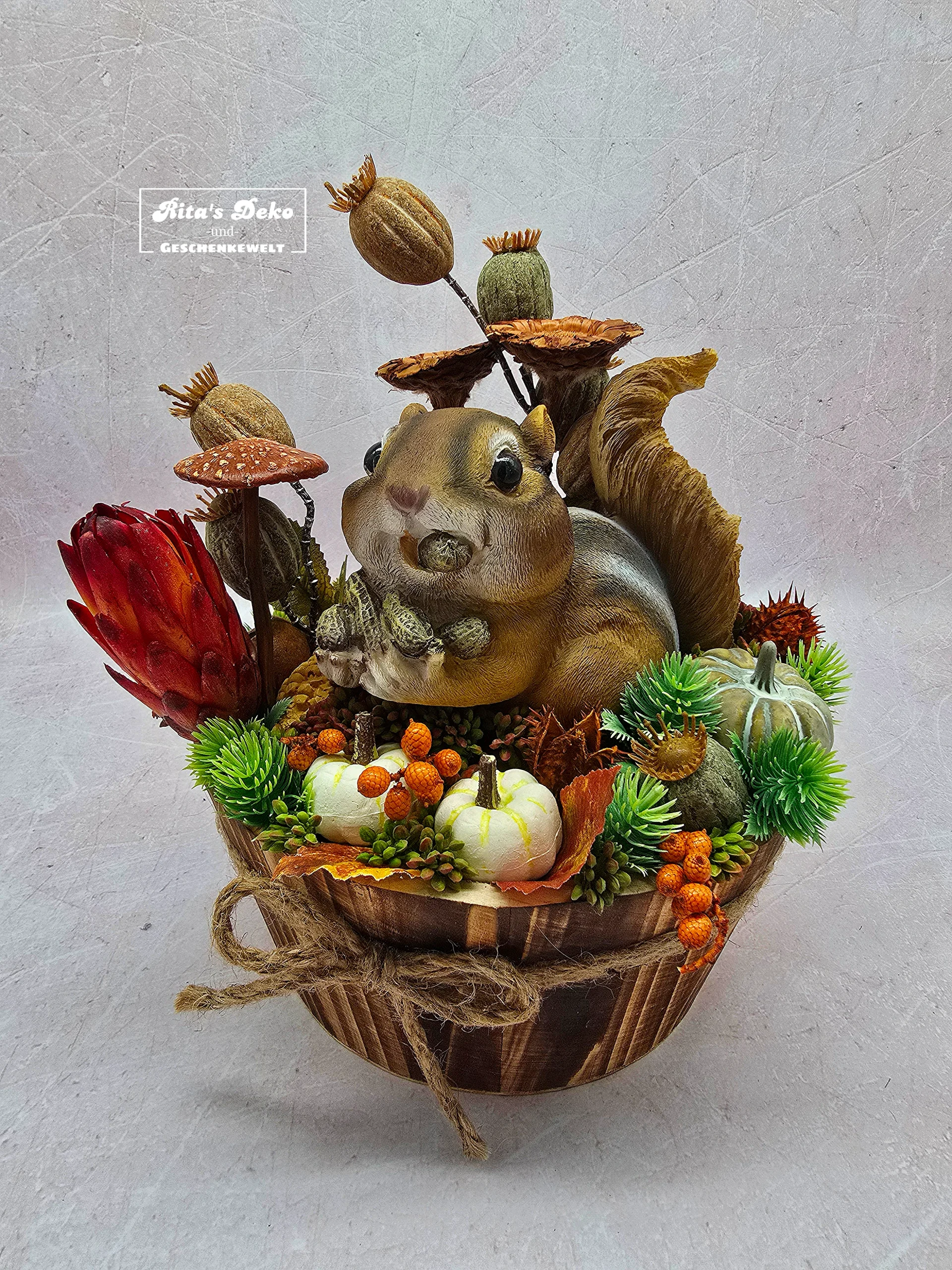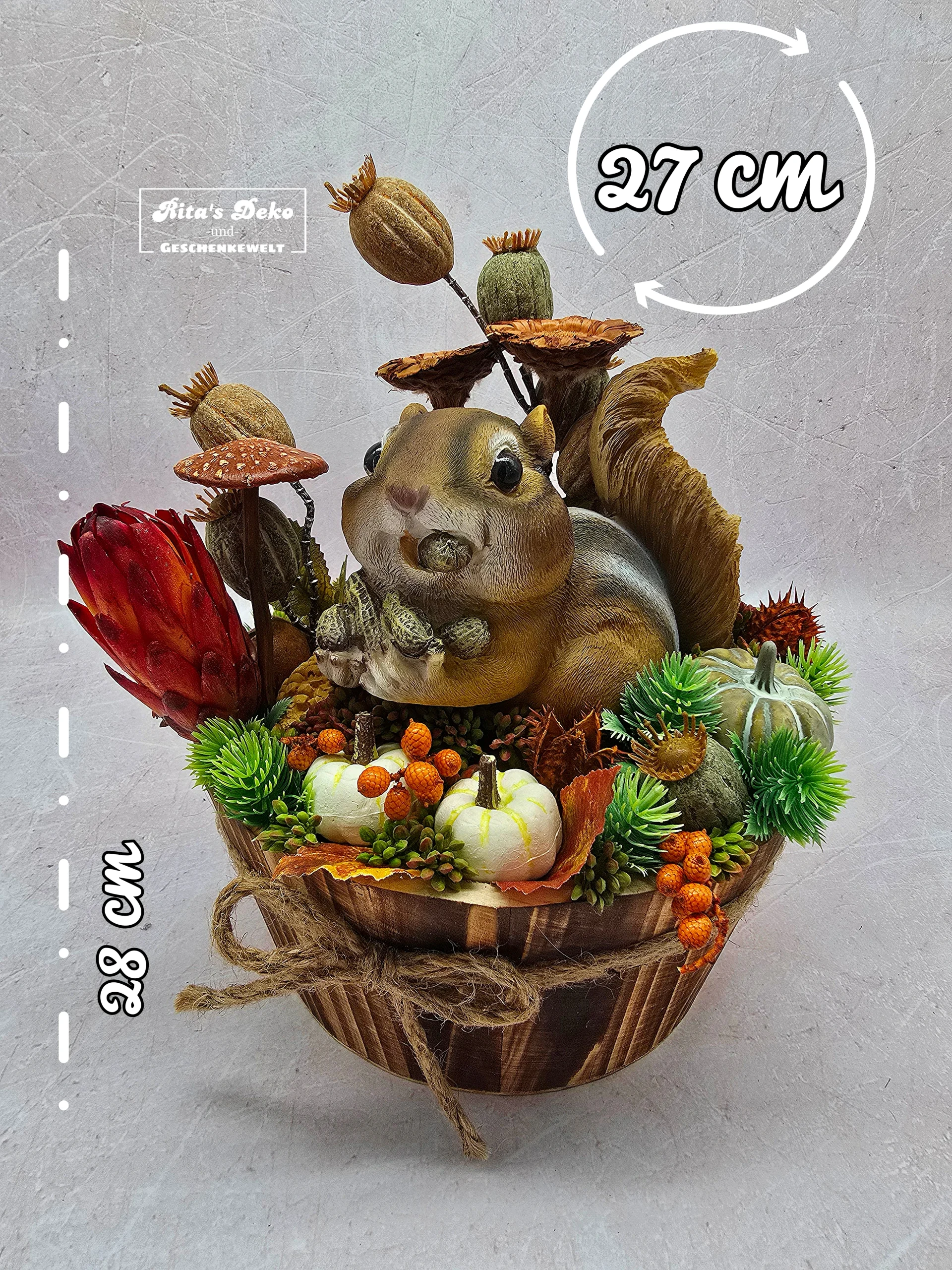 Diese herbstliche Tischdekoration bringt den Zauber des Waldes direkt in dein Zuhause! 🍄 Im Zentrum sitzt ein detailverliebtes Eichhörnchen, das inmitten von handverlesenen Dekoelementen wie Mohnkapseln, Pilzen, kleinen Kürbissen und Beeren neugierig aus dem Holzgefäß lugt. Die warmen Farbtöne und die natürlichen Materialien machen dieses Arrangement zu einem echten Blickfang auf jedem Tisch oder Regal.