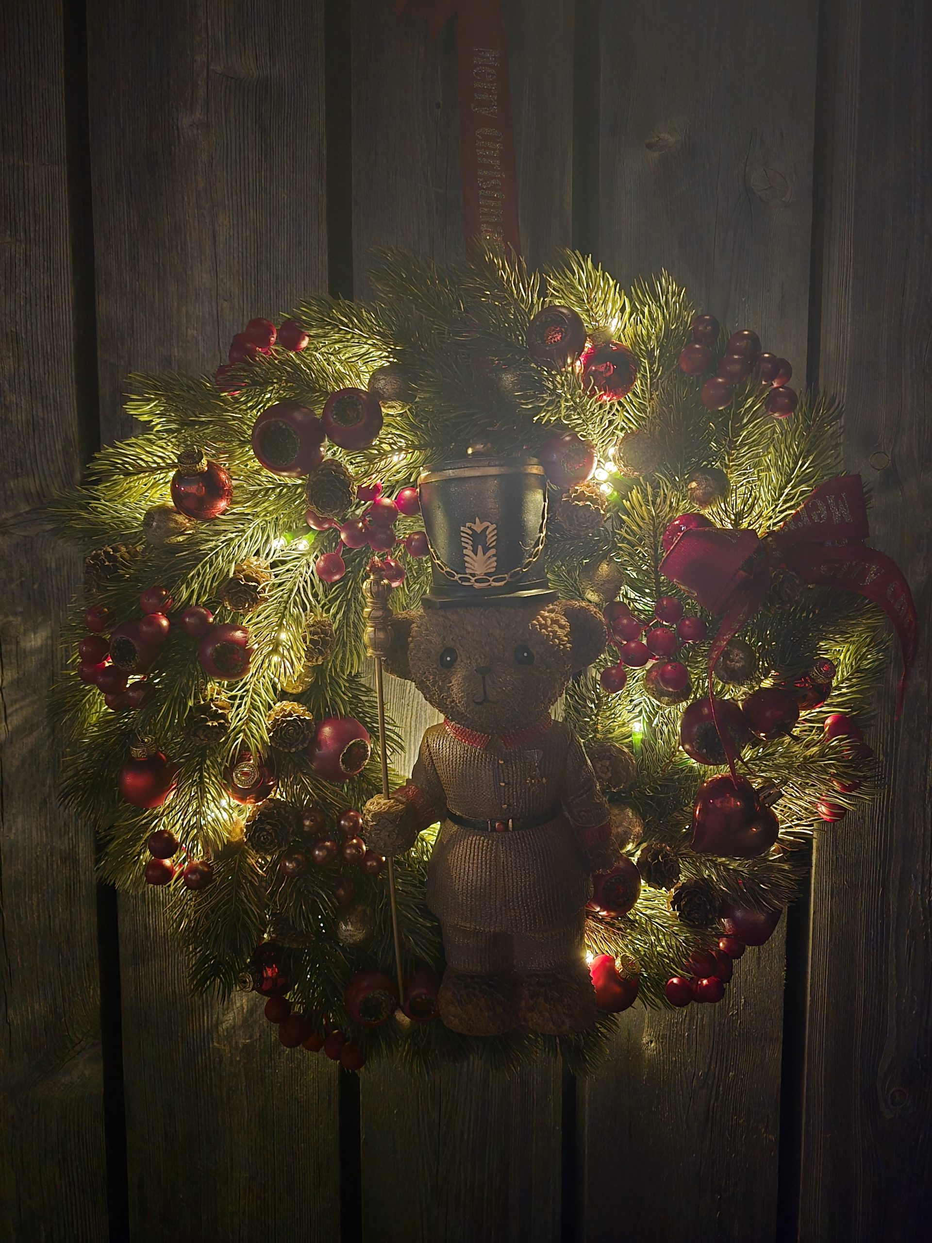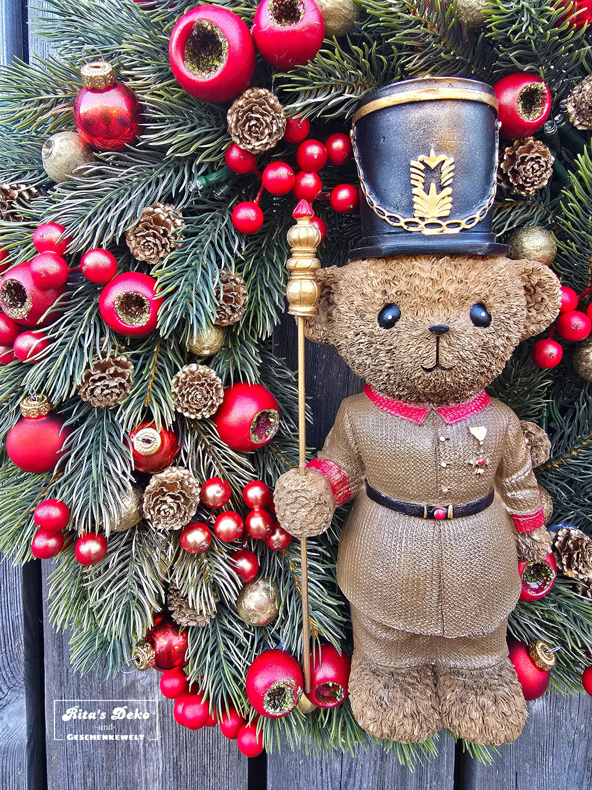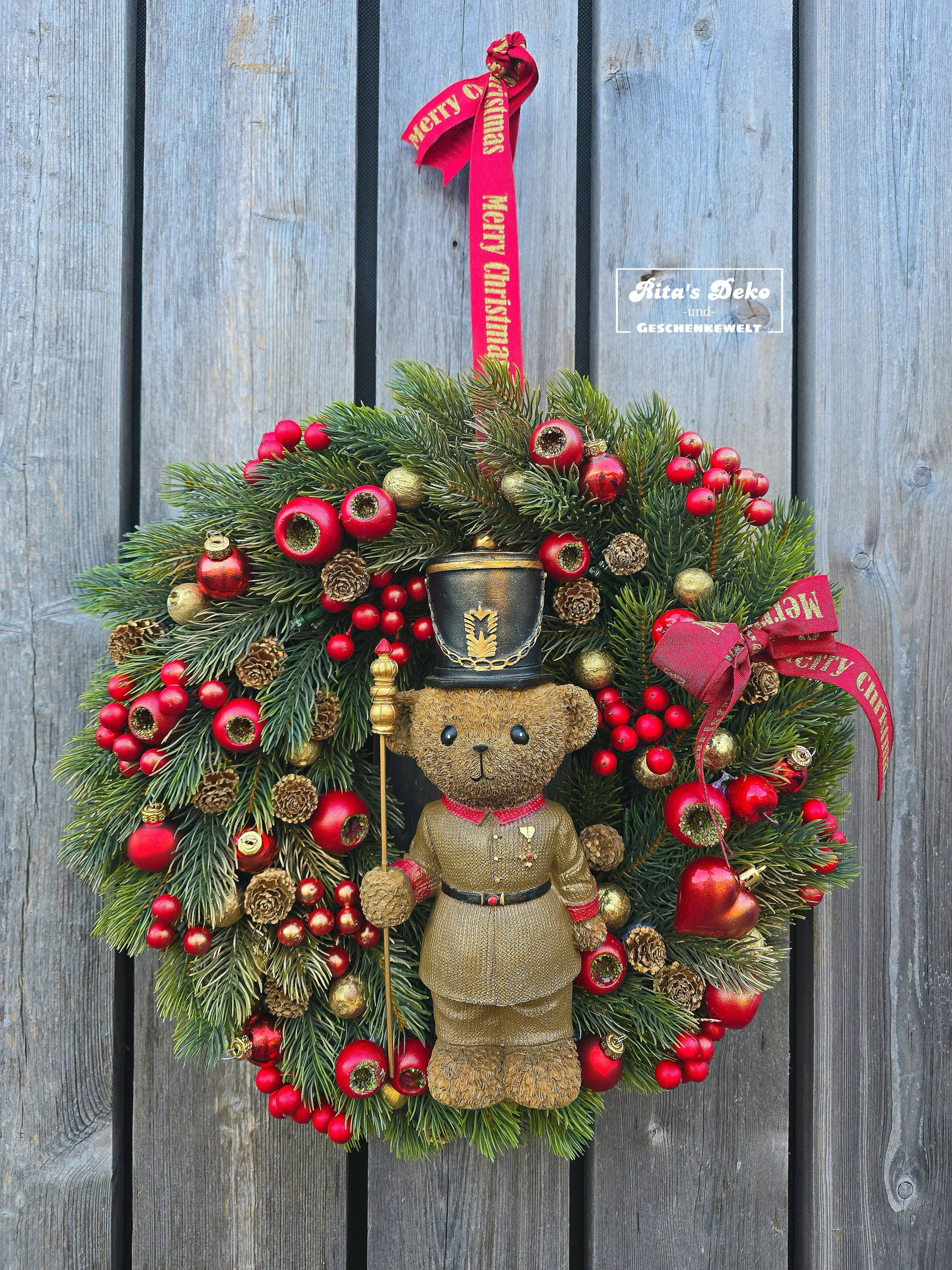 Ein festlicher Türkranz, der Tradition und Weihnachtszauber vereint ❤️ Der kleine Bär im goldenen Uniformmantel steht stolz inmitten von roten Beeren, glänzenden Kugeln und goldenen Akzenten – umgeben von dichtem, grünem Tannenzweigwerk. Die rote Merry Christmas-Schleife sorgt für den perfekten festlichen Abschluss 🎀