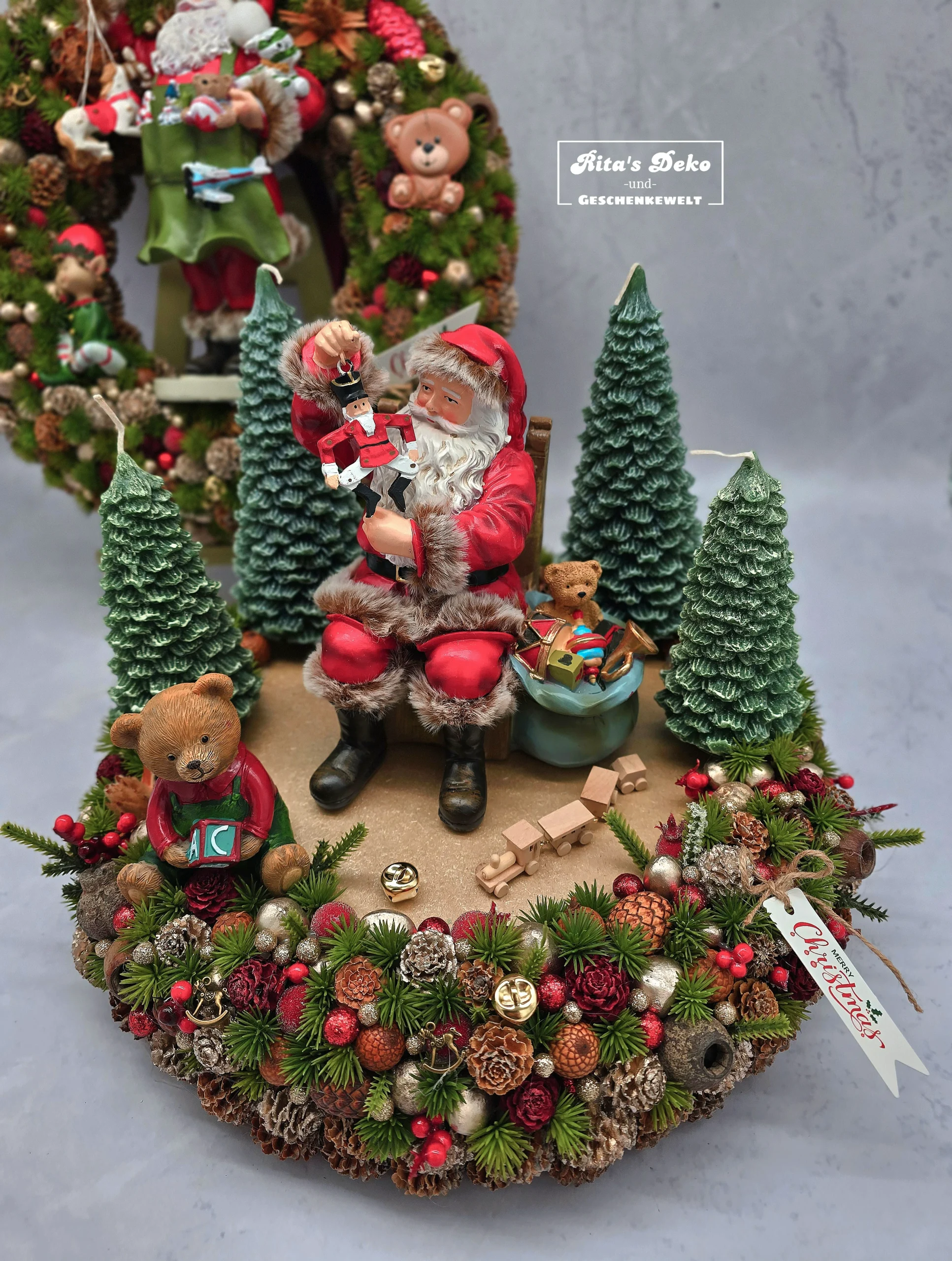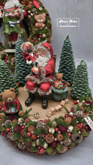 Mitten im Kranz sitzt der Weihnachtsmann in seinem Sessel und baut voller Hingabe neues Spielzeug für die Festtage. Umgeben von Teddys, Holzeisenbahn, Geschenken und verschneiten Tannenbäumen entsteht eine märchenhafte Szene, die Kindheitserinnerungen wach werden lässt. 🎁🌲✨