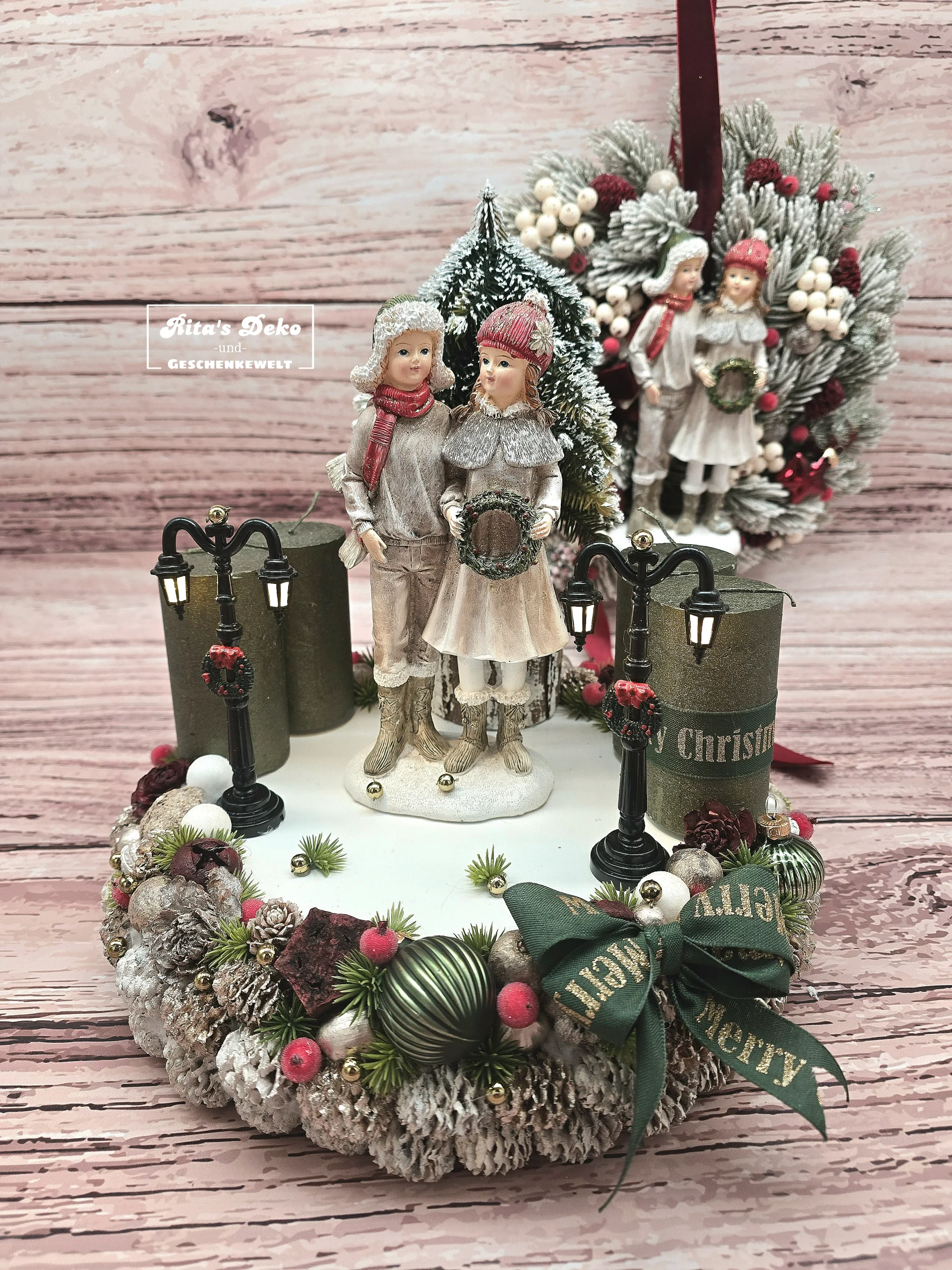Ein Adventskranz wie aus einem alten Weihnachtsmärchen ✨ Zwei Kinder stehen eng beieinander, festlich gekleidet, während die Schneeflocken leise um sie tanzen 🤍 Ihre Laternen und die kleinen Straßenlampen leuchten warm und schaffen eine traumhafte, stimmungsvolle Atmosphäre 🕯️🌨️ Hinter ihnen funkelt ein schneebedeckter Tannenbaum, umgeben von edlen Kugeln, Zapfen und roten Beeren. Die Basis ist in harmonischen Grün-, Gold- und Cremetönen gestaltet, verziert mit einer eleganten Schleife mit Merry Christmas 🎀💚