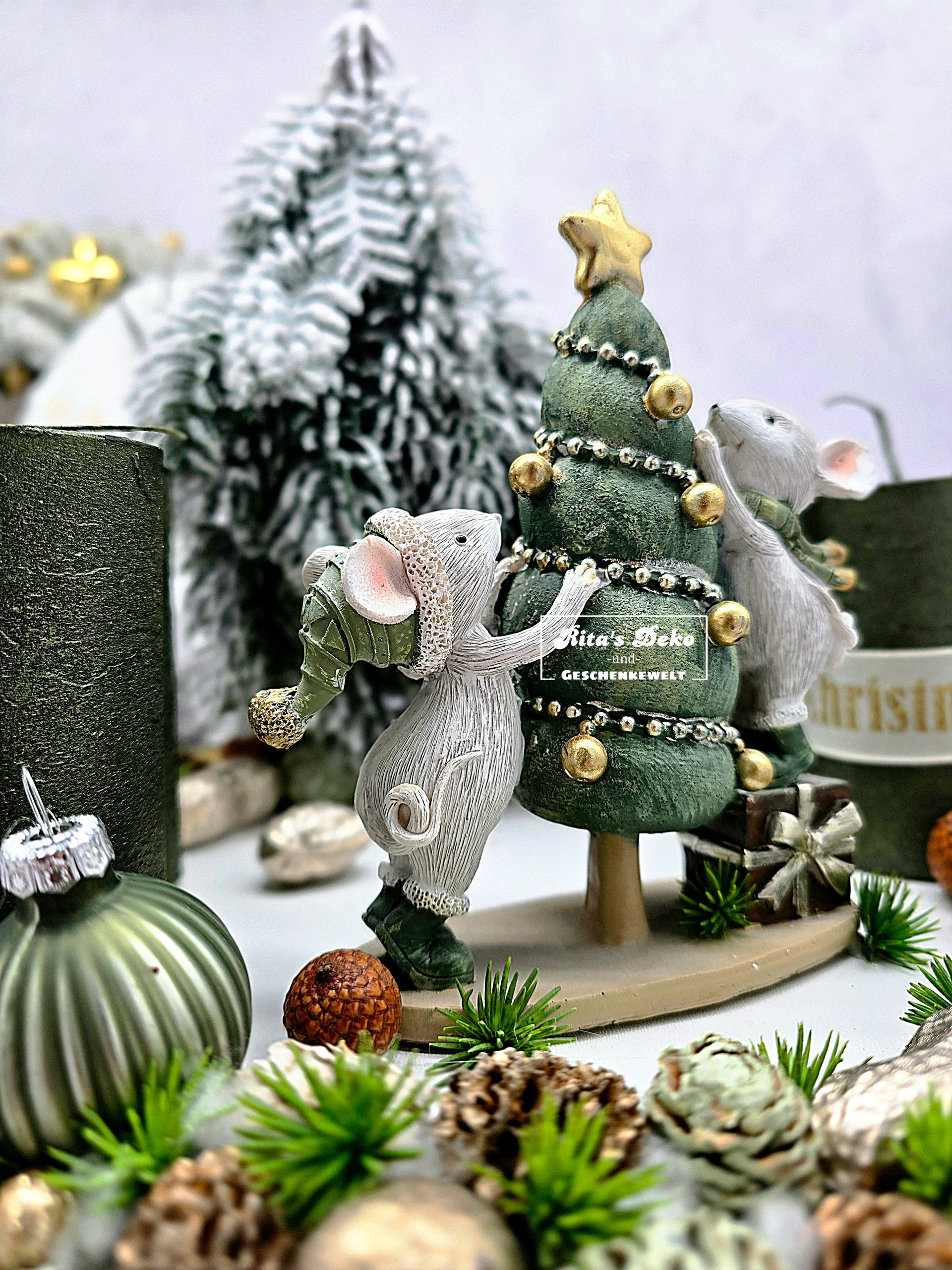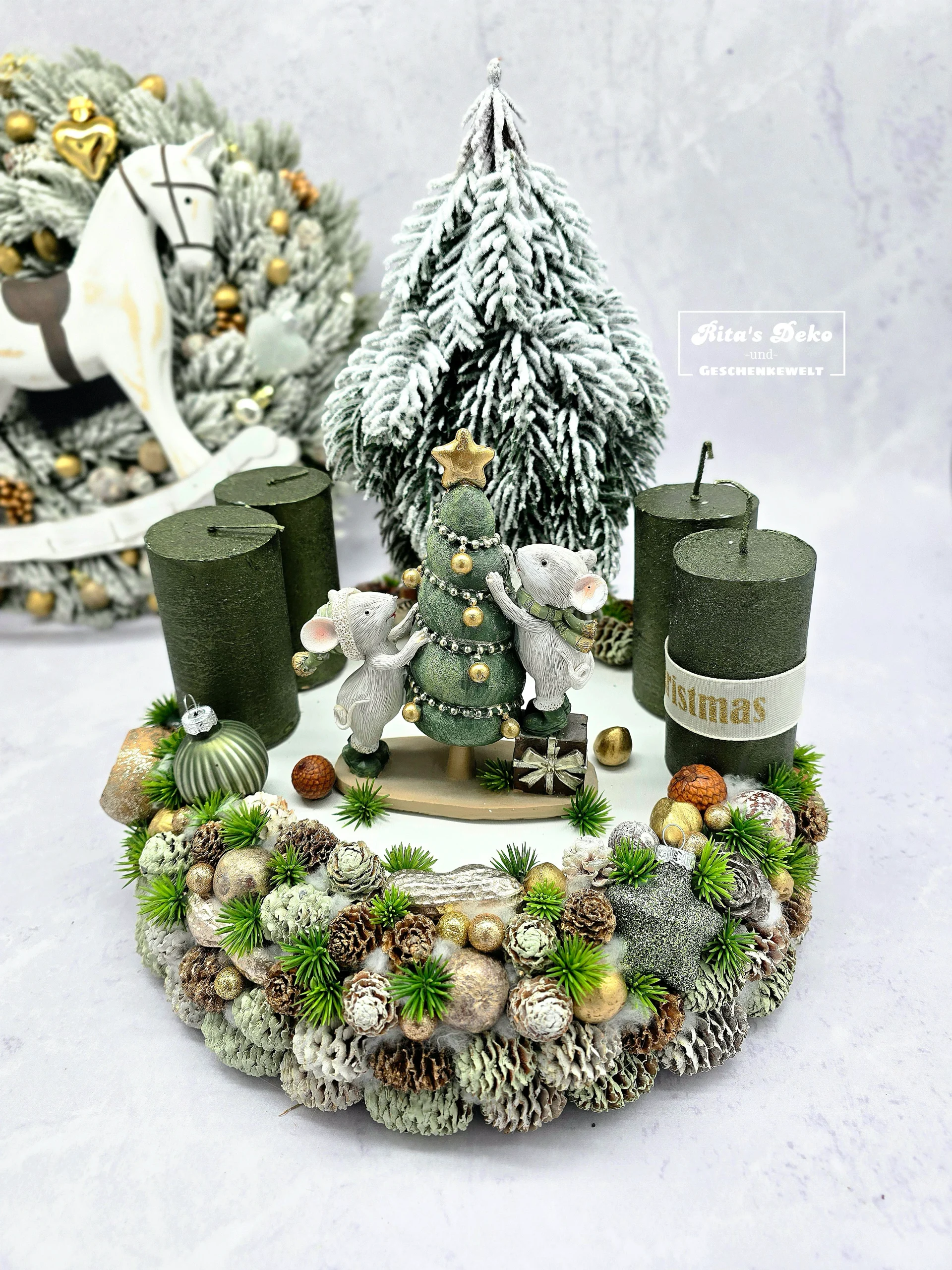 Ein liebevoll gestalteter Adventskranz in sanften Grüntönen, der winterliche Eleganz und verspielte Details vereint 🎄✨ Die Basis besteht aus naturgetreu gefrosteten Zapfen, kleinen Kugeln und grünen Moosakzenten, die dem Kranz eine frische, natürliche Note verleihen. In der Mitte steht eine zauberhafte Szene mit zwei Mäuschen 🐭🐭, die fröhlich einen kleinen Weihnachtsbaum schmücken – geschmückt mit goldenen Kugeln und einem glänzenden Stern auf der Spitze 🌟. Dahinter sorgt ein schneebedeckter Baum für echtes Winterfeeling, während vier dunkelgrüne Kerzen das Gesamtbild harmonisch abrunden und für stimmungsvolles Licht sorgen 🕯️💚